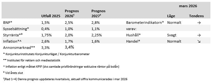 Konjunkturen har varit svår att förutse de senaste åren. Vid flera tillfällen har prognoserna genomgått betydande justeringar. Bakgrunden är dels att vi lämnade en svår lågkonjunktur 2024, präglad av hög ränta och inflation. Dels ett geopolitiskt läge som hela tiden överraskar marknaden. Med tiden har dock marknaden blivit lite mer luttrad och tar därför inte politiska utspel på lika stort allvar i dag som för ett år sedan. Irankonflikten har dock inneburit ytterligare en störning som nu gör att tillväxtutsikterna återigen skrivs ner. 2026 förväntas visserligen bli ett hyfsat år i Sverige med 2,5 procents BNP-tillväxt, men det innebär ändå en nedgradering jämfört med Konjunkturinstitutets prognos i december 2025. I stället har prognosen för 2027 skrivits upp något. Samtidigt har inflationsprognosen höjts på grund av stigande oljepriser. Nivån är dock fortfarande under Riksbankens mål på 2,0 procent, vilket därmed inte förväntas leda till höjning av styrräntan. Osäkerheten på finansmarknaderna har dock ökat bankernas upplåningskostnad, vilket har lett till något högre bolåneräntor.