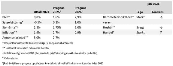 Konjunkturinstitutets konjunkturbarometer var nästan oförändrad när januaris siffror presenterades. Det betyder att läget fortfarande anses vara starkt. De sektorerna som släpar lite efter är hushåll och byggverksamhet. 2026 förväntas bli ett år präglat av relativt stark ekonomisk tillväxt, framför allt om man jämför med de föregående åren och hur läget ser ut i övriga EU. Helårssiffrorna för 2025 har dock inte presenterats ännu och förväntningarna på det fjärde kvartalet är högt ställda efter den mycket goda utvecklingen under det tredje. Ett sämre utfall skulle antagligen innebära att prognosmakarna återigen blir mer negativa. Den expansiva finanspolitiken och det låga inflationstrycket tillsammans med relativt höga löneökningar under 2026 bör dock ge goda förutsättningar för en bra ekonomisk utveckling under året.
